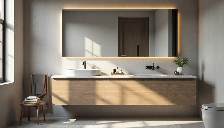 کابینتهای تمام چوب یا ترکیبی از چوب و MDF رنگشده با پوشش مات و دستگیرههای مخفی، انتخابی محبوب برای طراحیهای مدرن هستند.حمام و سرویس بهداشتی با المانهای چوبی